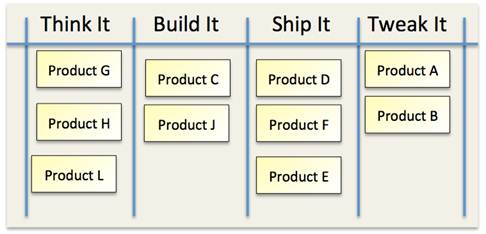 All major product initiatives go through four stages Think It”, Build It”, Ship It”, and Tweak It”. Heres a picture illustrating the flow from idea to product, and what comes out of each stage along the way. You’ll find a more detailed version of this picture at the end of the article.