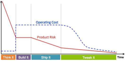 As you can see, the Think It stage drives down risk at a low cost.  You can also see why we want to shorten the Build It stage as much as possible (high operating cost and little risk reduction). The gradually reduced operating cost in Tweak It reflects that, over time, the product doesnt need to be updated as much and squads can start moving on to other things.
