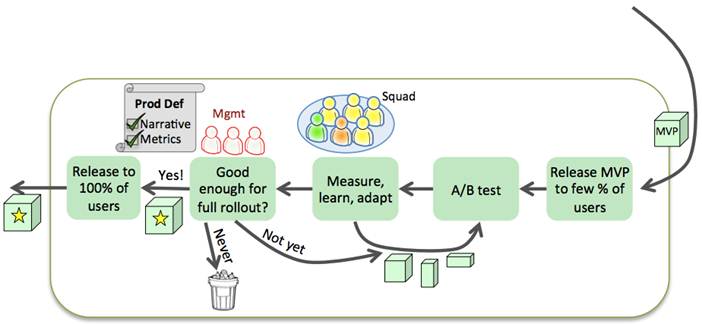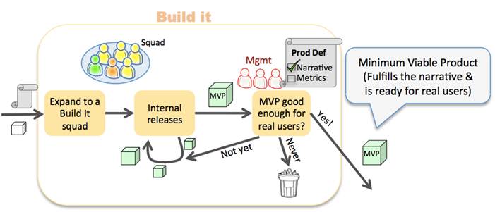 Definition of Done: The Build It stage ends when management and the squad jointly believe that this product fulfills the basic narrative and is good enough to start releasing to real users.